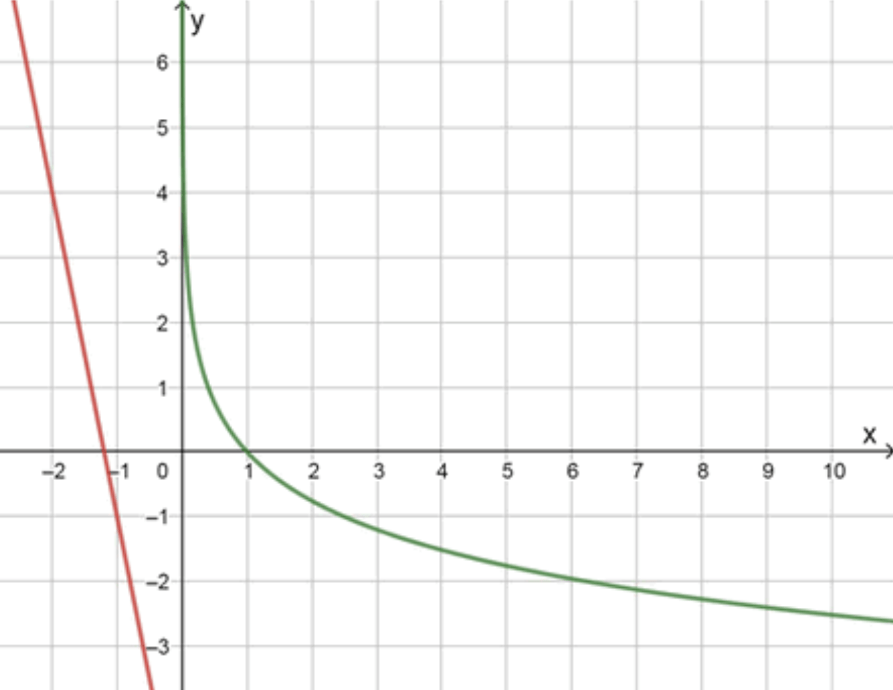 Функции убывают, но логарифм убывает медленно, а прямая — быстро