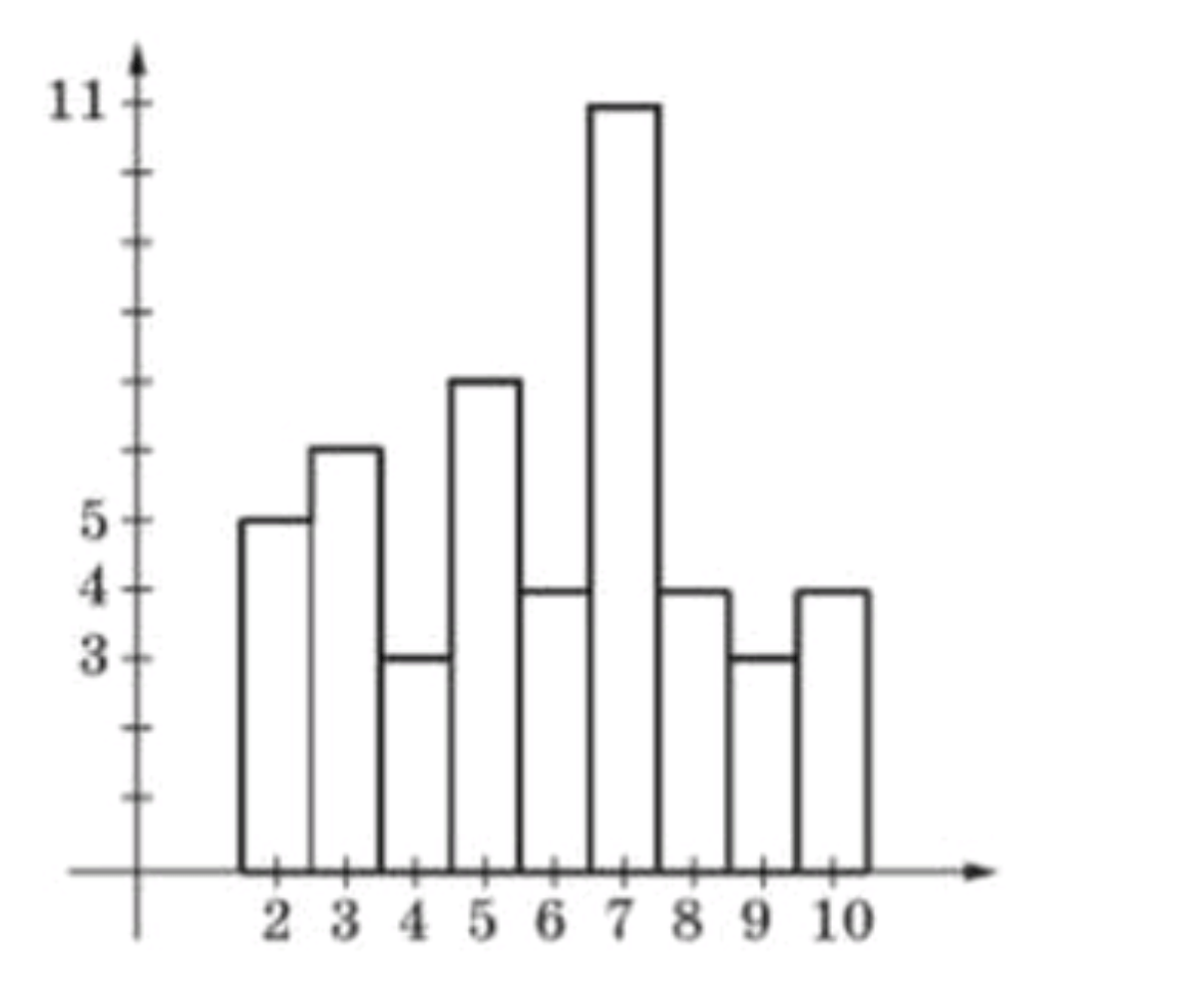 Каждому значению варианта соответствует число, которое показывает, сколько раз оно встречается (по гистограмме). Например, значение 2 встречается 5 раз, значение 7 — 11 раз и т.д.