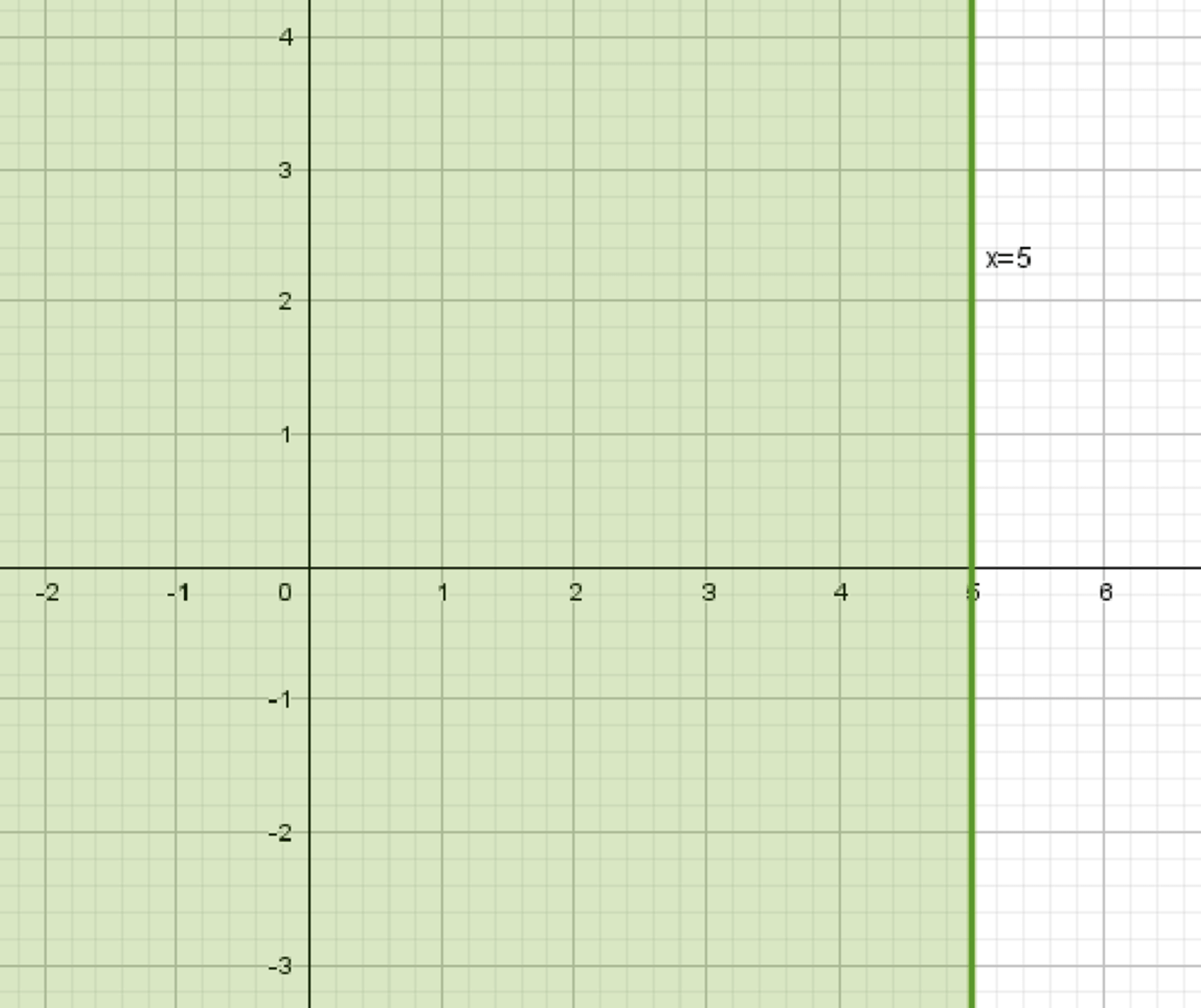 - Отметим область, где \(x < 5\), то есть все точки, лежащие левее прямой \(x = 5\).