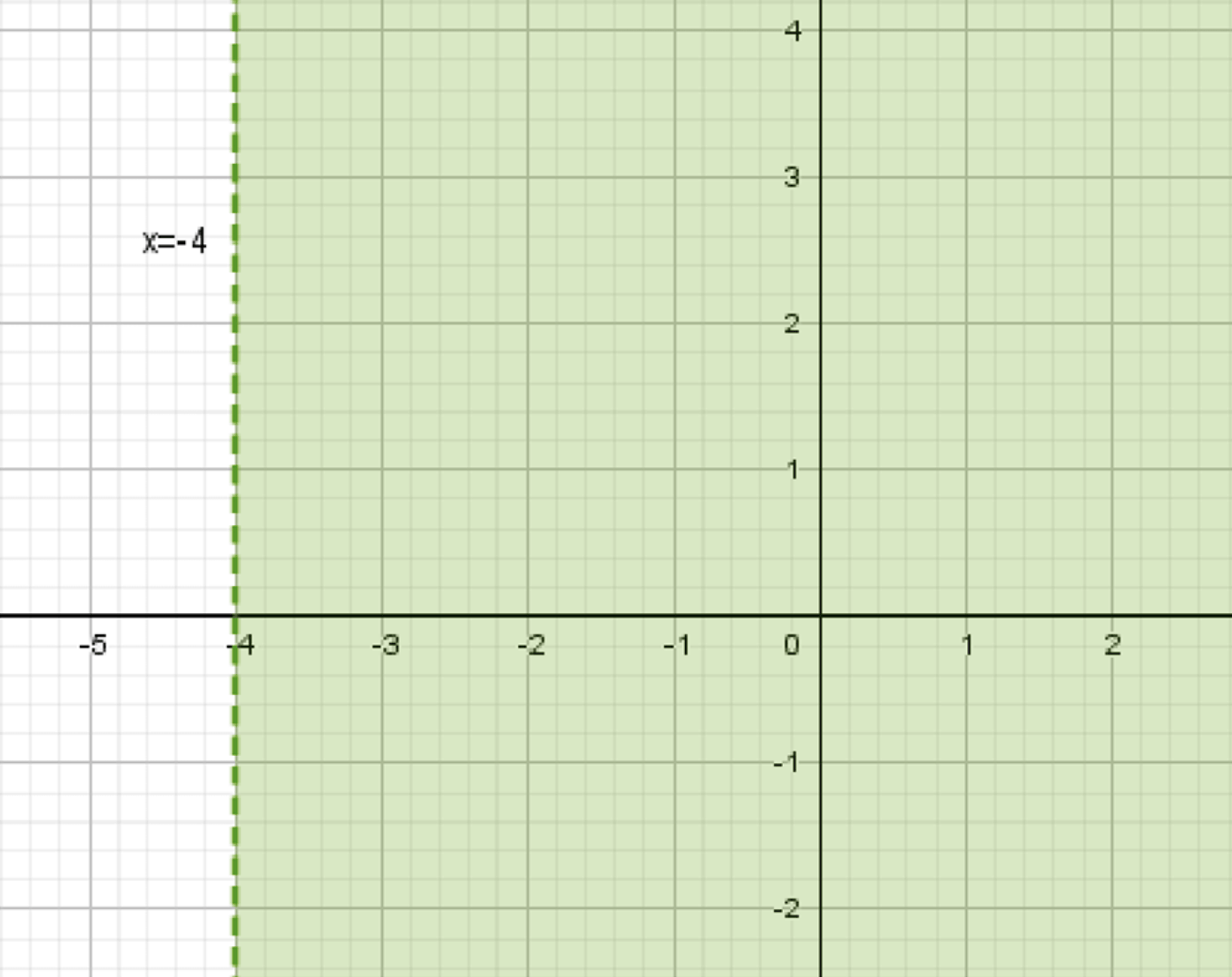 - Так как знак неравенства \(>\), точки, лежащие на прямой \(x = -4\), не включаются в множество (прямая будет пунктирной).
