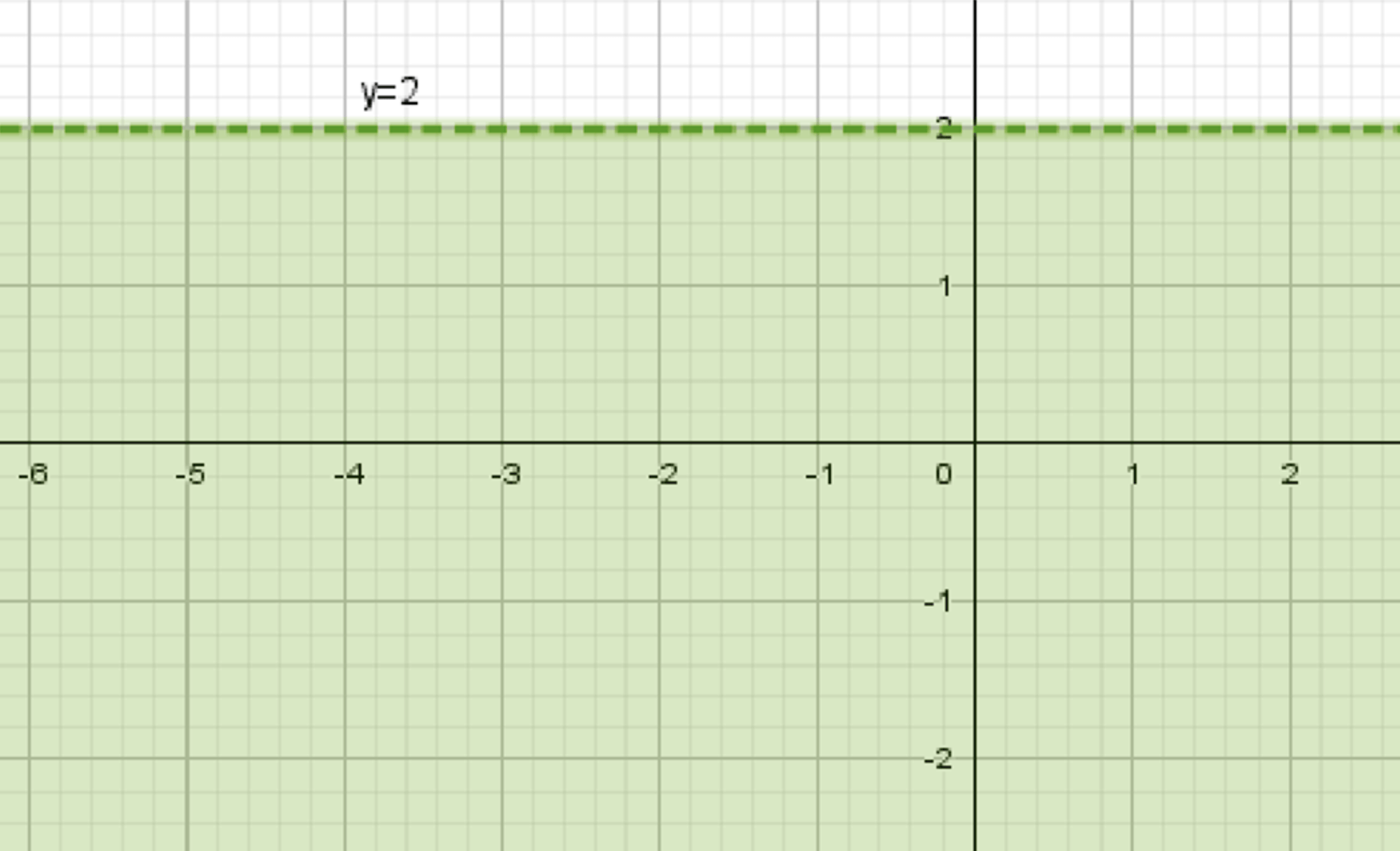 - Так как знак неравенства \(<\), точки, лежащие на прямой \(y = 2\), не включаются в множество (прямая будет пунктирной).
