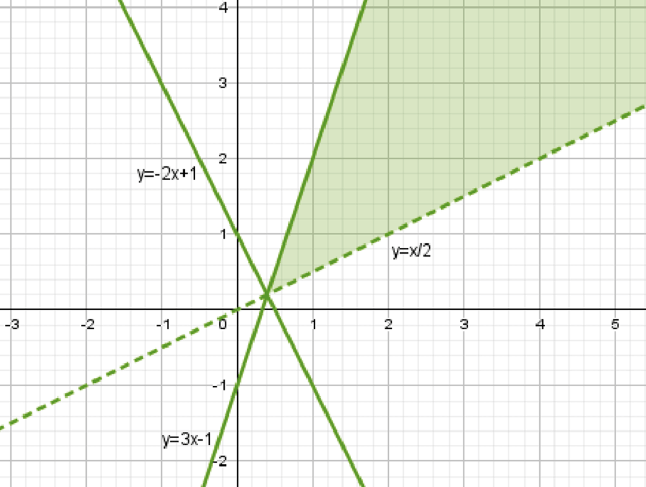 Область решения: пересечение областей выше прямых \( y = \frac{1}{2}x \), \( y = 3x — 1 \).