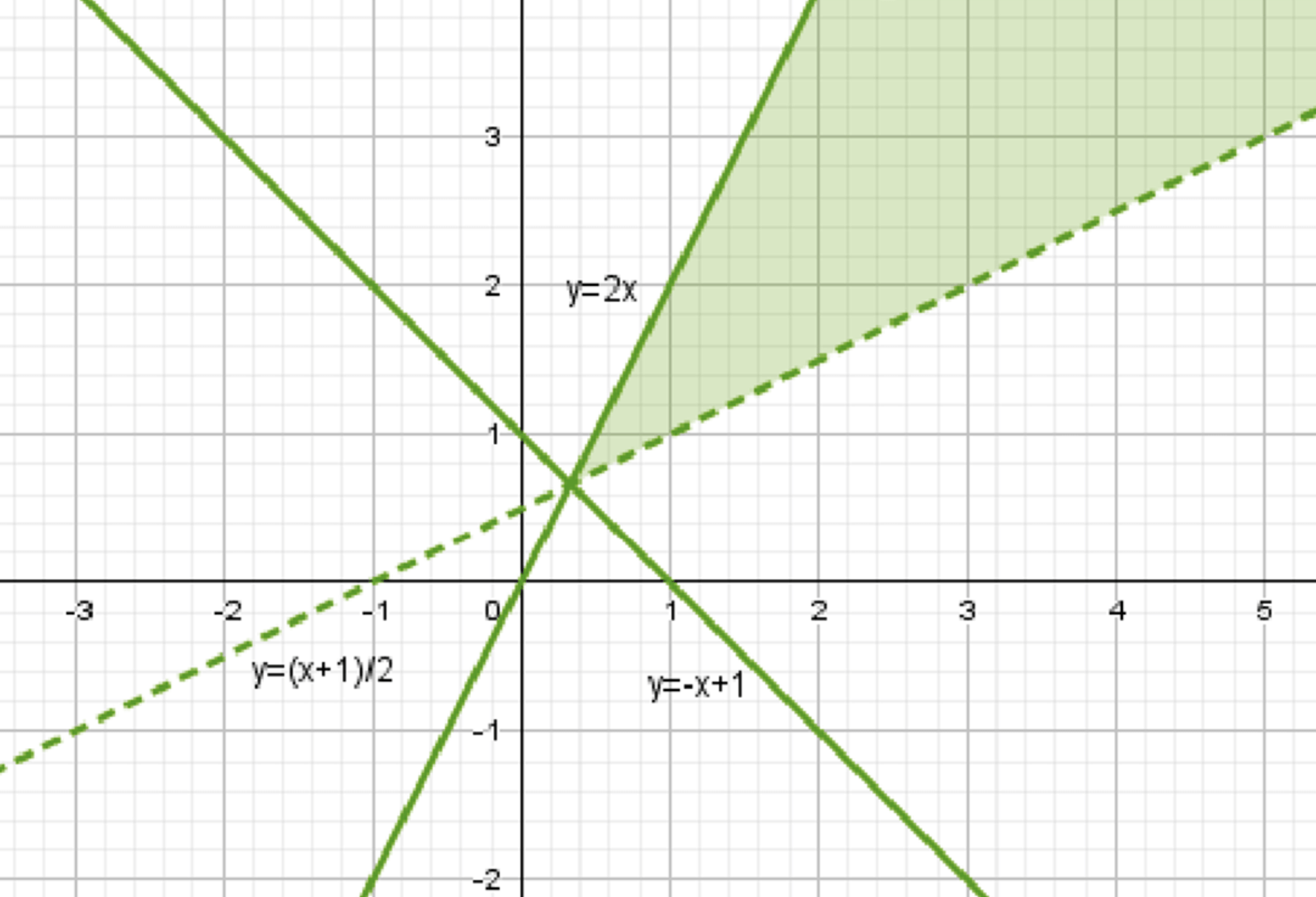 Область решения: пересечение областей выше прямой \( y = \frac{1}{2}x + \frac{1}{2} \), ниже прямой \( y = 2x \).