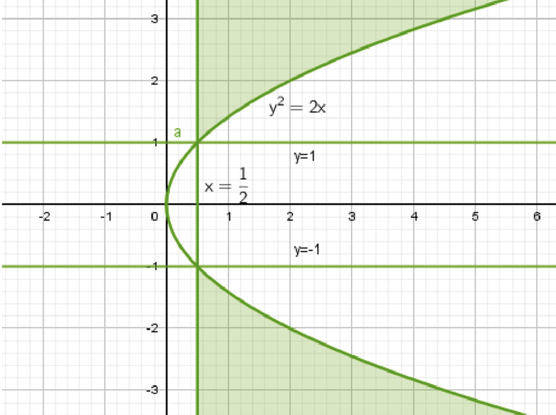 Область решения: пересечение областей слева от параболы \( x = \frac{1}{2}y^2 \), справа от прямой \( x = \frac{1}{2} \).