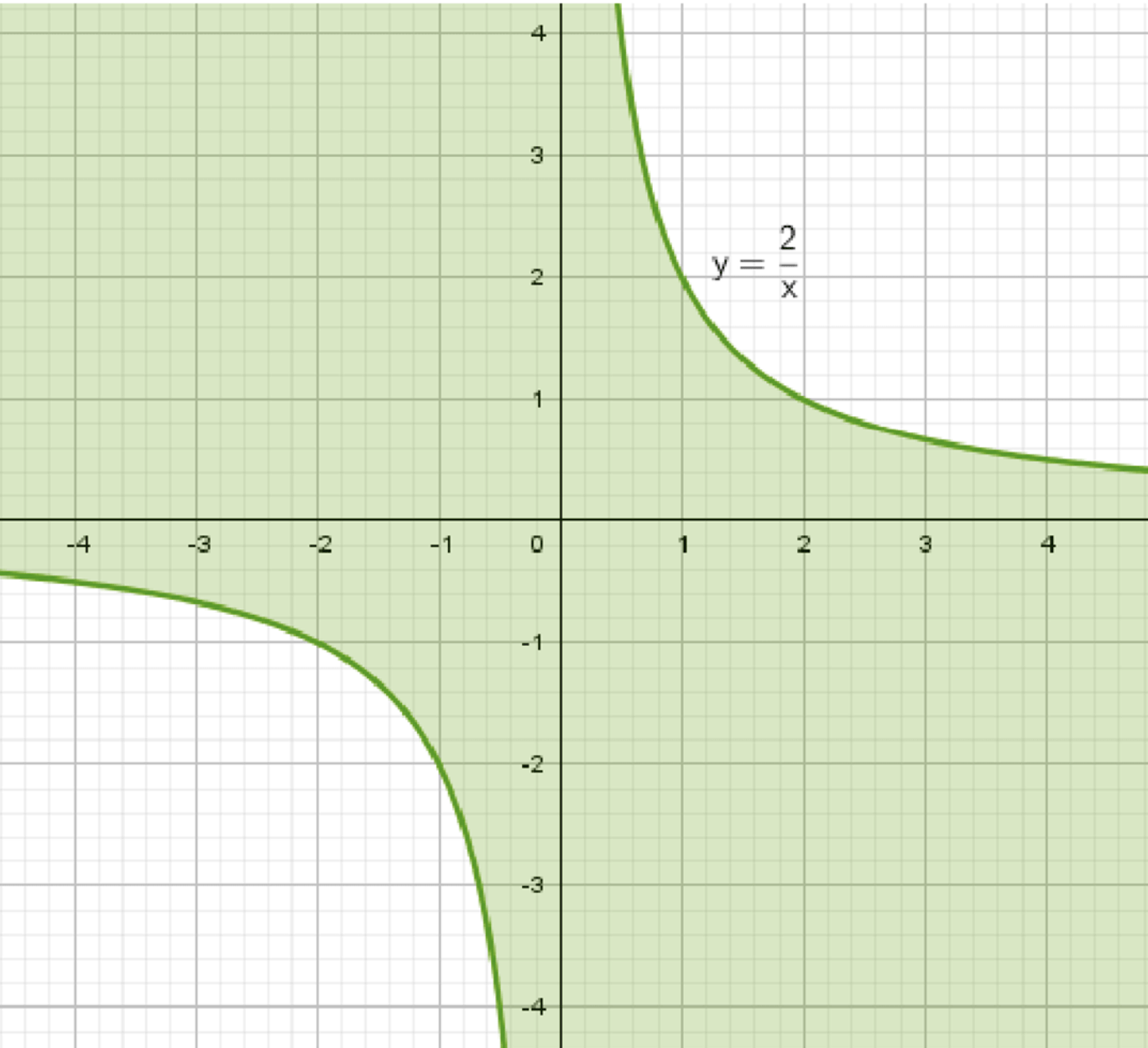Графически это соответствует ветви гиперболы \( y = \frac{2}{x} \), расположенной в первой координатной четверти. Все точки ниже этой гиперболы удовлетворяют неравенству.