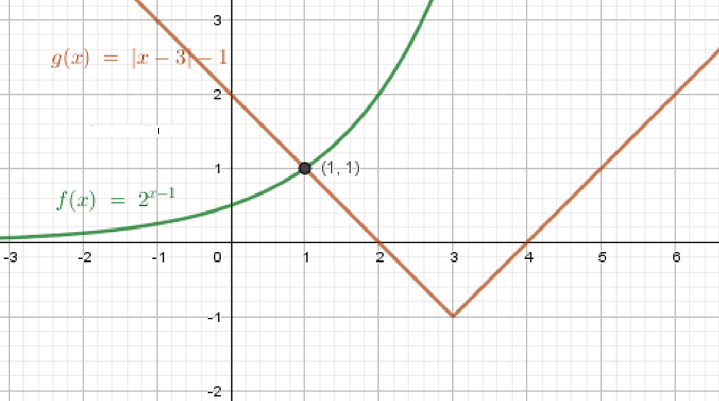 \( \left\{\begin{array}{l} y=2^{x-1} \\ y=|x-3|-1 ; \end{array}\right. \).