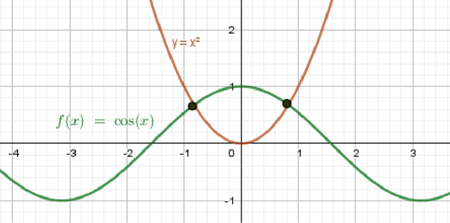 Графики функций пересекаются в двух точках, что можно увидеть при их построении.