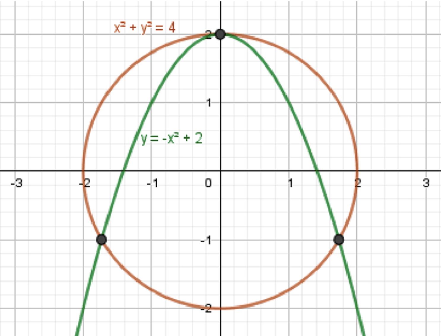Второе уравнение \(y = 2 — x^2\) описывает параболу, которая имеет вершину в точке \((x_0 = 0, y_0 = 2)\).