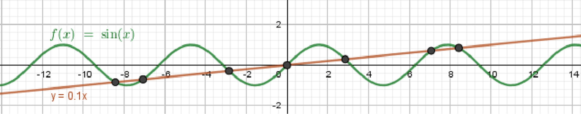 Графики функций пересекаются в семи точках, что можно увидеть при их построении.