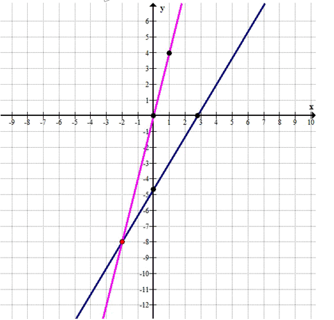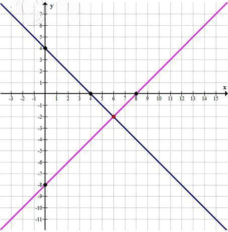 Найдите координаты точки пересечения прямых: а) х + у = 4 и х = 8 + у; б) 5х — 3у = 14 и у — 4х = 0.
