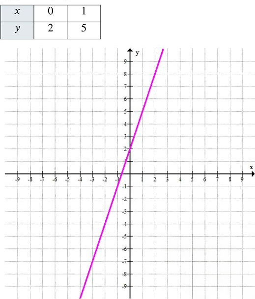 \( y = 3 \cdot 0 + 2 = 2 \) → точка \( (0; 2) \)