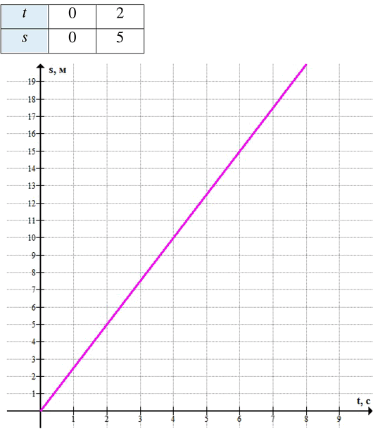 \( s = 2{,}5 \cdot 2 = 5 \) → точка \( (2; 5) \)