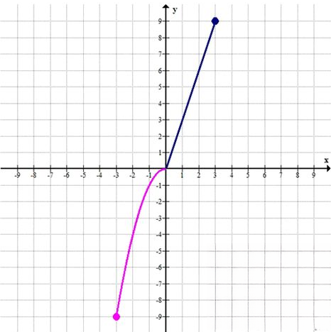 \( y = \begin{cases} -x^2, & \text{если } -3 \le x \le 0 \\ 3x, & \text{если } 0 < x \le 3 \end{cases} \)и