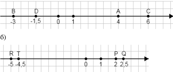 Изображены две координатные прямые — а) и б). На каждой отмечены точки с указанными координатами.