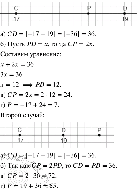 Точки \(C(-17)\), \(D(19)\) и \(P(x)\) расположены на координатной прямой так, что \(CP = 2PD\).