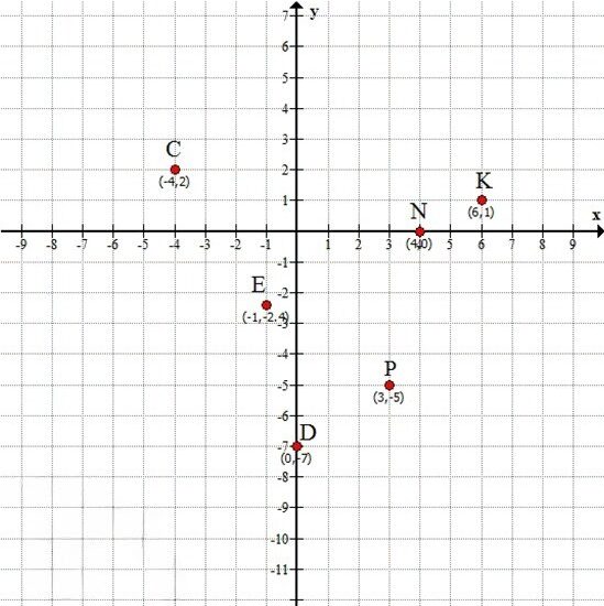 Координата \(x = 3\) (положительная), координата \(y = -5\) (отрицательная).