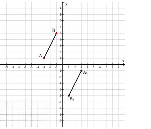 Отрезок \( AB \) лежит в третьей и четвёртой четвертях, его образ \( A_1B_1 \) — в первой и второй.