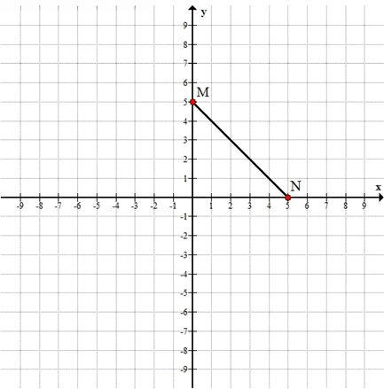 Отрезок \( MN \) является гипотенузой прямоугольного треугольника с катетами по осям координат, а его длина равна \( \sqrt{(5 — 0)^2 + (0 — 5)^2} = \sqrt{25 + 25} = \sqrt{50} = 5\sqrt{2} \).