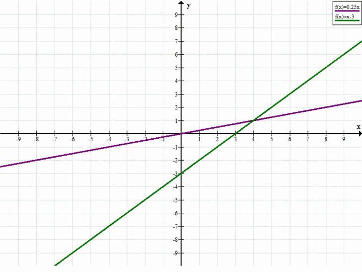 \(0{,}25x — x = -3 \Rightarrow -0{,}75x = -3 \Rightarrow x = \frac{-3}{-0{,}75} = 4\).