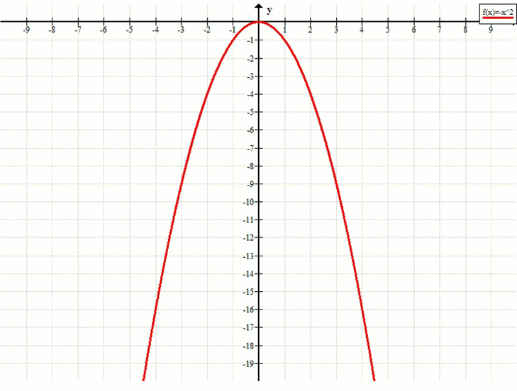 Это квадратичная функция, график которой — парабола, ветви направлены вниз, вершина находится в начале координат \((0; 0)\). Функция чётная (\(f(-x) = f(x)\)), непрерывна на всей числовой прямой. Область определения — \((-\infty; +\infty)\), область значений — \((-\infty; 0]\). Наибольшее значение функции равно 0 и достигается при \(x = 0\); наименьшего значения нет.