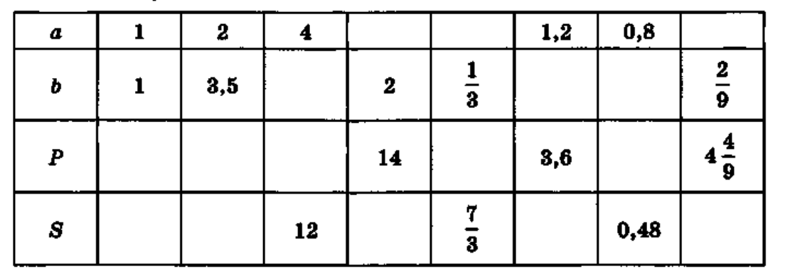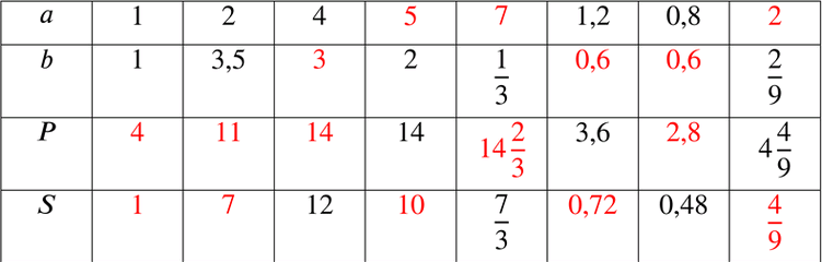 Пусть а см и b см — длины сторон прямоугольника, Р см — его периметр, S см2 — площадь. Заполните таблицу: