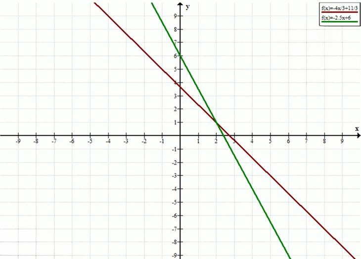 Построим графики функций \(y = \frac{11 — 4x}{3}\) и \(y = \frac{12 — 5x}{2}\).