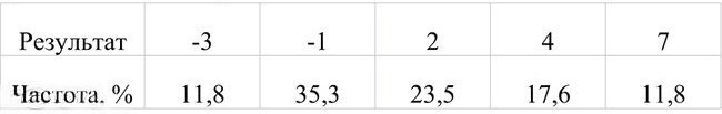 б) процентные частоты: \(-3\) — 11,8%; \(-1\) — 35,3%; \(2\) — 23,5%; \(4\) — 17,6%