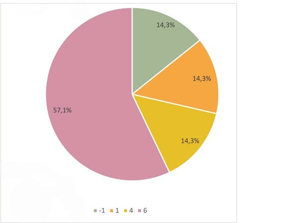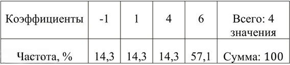 в) относительные частоты: –1 → 14,3%, 1 → 14,3%, 4 → 14,3%, 6 → 57,1%