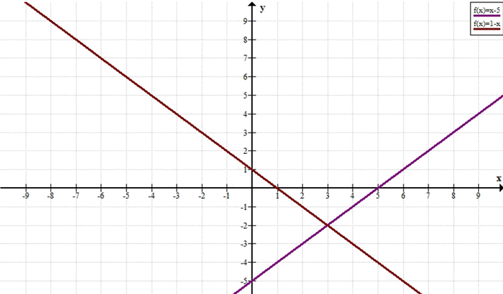 Решение: две прямые \( y = x — 5 \) и \( y = -x + 1 \).