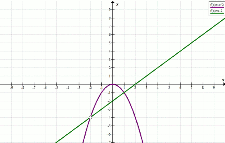 График функции \(y = -x^2\) (с выколотой точкой при \(x = -2\)) пересекает прямую \(y = x — 2\) в точке \(x = 1\).