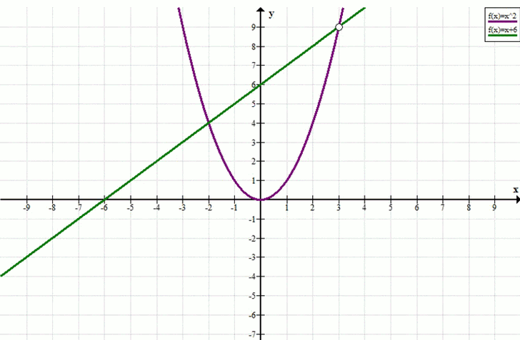 Графически: парабола \(y = x^2\) (без точки \(x = 3\)) и прямая \(y = x + 6\) пересекаются в точке \(x = -2\).