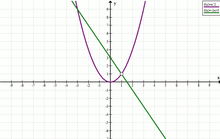 Графически: функция \(y = x^2\) (с выколотой точкой при \(x = 1\)) и прямая \(y = -2x + 3\) пересекаются в точке \(x = -3\).