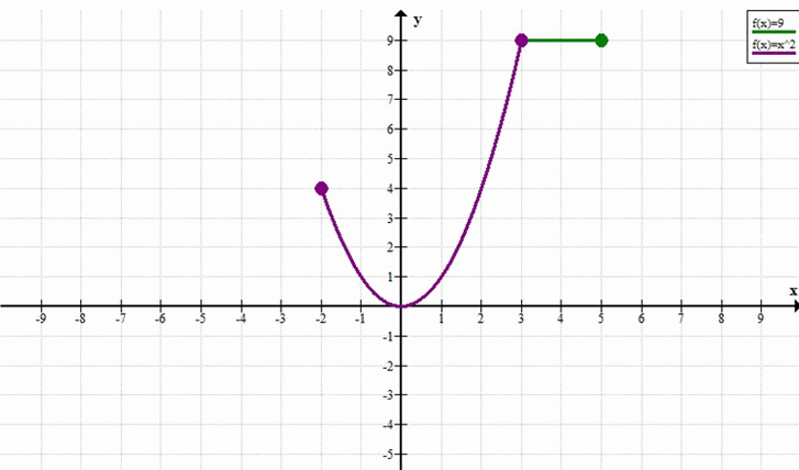 Ответ: \( y = \begin{cases} x^2, & \text{если } -2 \le x \le 2 \\ 9, & \text{если } 3 < x \le 5 \end{cases} \)