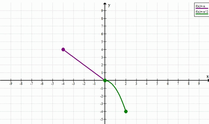 Ответ: \( \{ (x, -x) \mid -4 \le x < 0 \} \cup \{ (x, -x^2) \mid 0 \le x \le 2 \} \)