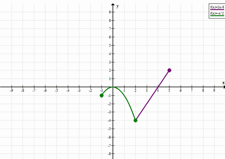 \( y = \begin{cases} -x^2, & \text{если } -1 \le x \le 2 \\ 2x — 8, & \text{если } 2 < x \le 5 \end{cases} \)