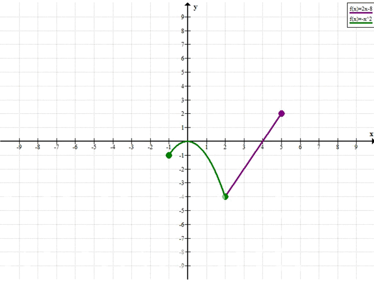 Первая часть задана на \([-1; 2]\), вторая — на \((2; 5]\).