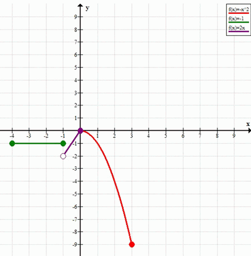 \(y=\begin{cases} 2x, & \text{если } -4 \le x \le -1 \\ -x^2, & \text{если } -1 < x \le 0 \\ -x^2, & \text{если } 0 < x \le 3 \end{cases}\)