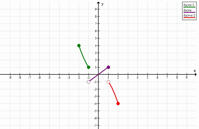 Ответ: \( y = \begin{cases} x^2, & \text{если } -2 \le x \le -1 \\ x, & \text{если } -1 < x \le 1 \\ -x^2, & \text{если } 1 < x \le 2 \end{cases} \)