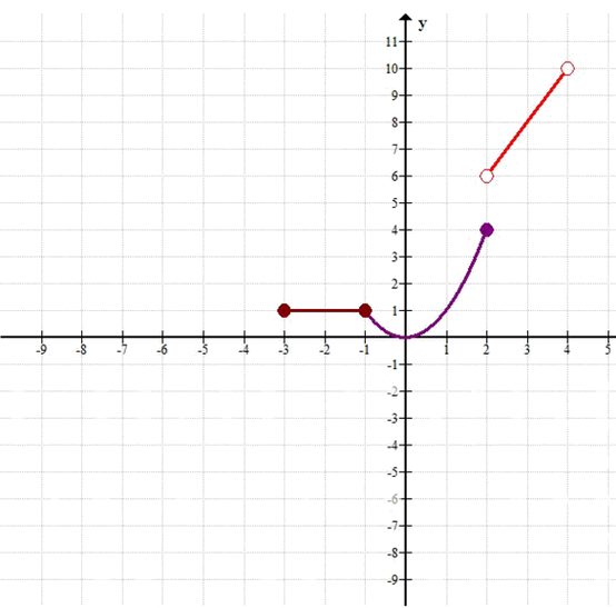 Ответ: График состоит из отрезка \( y=1 \) для \( x \in [-3, -1] \), отрезка \( y=2x+2 \) для \( x \in (-1, 2] \) (с выколотой точкой \( (-1,0) \) и закрашенной точкой \( (2,6) \)), и отрезка \( y=x \) для \( x \in (2, 4) \) (с выколотыми точками \( (2,2) \) и \( (4,4) \)).