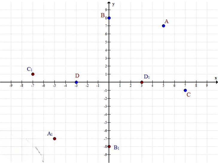 На координатной плоскости хОу найдите точку, симметричную данной точке относительно начала координат: а) А(5; 7); б) B(0; 8); в) С(7; -1); г) D(-3; 0).