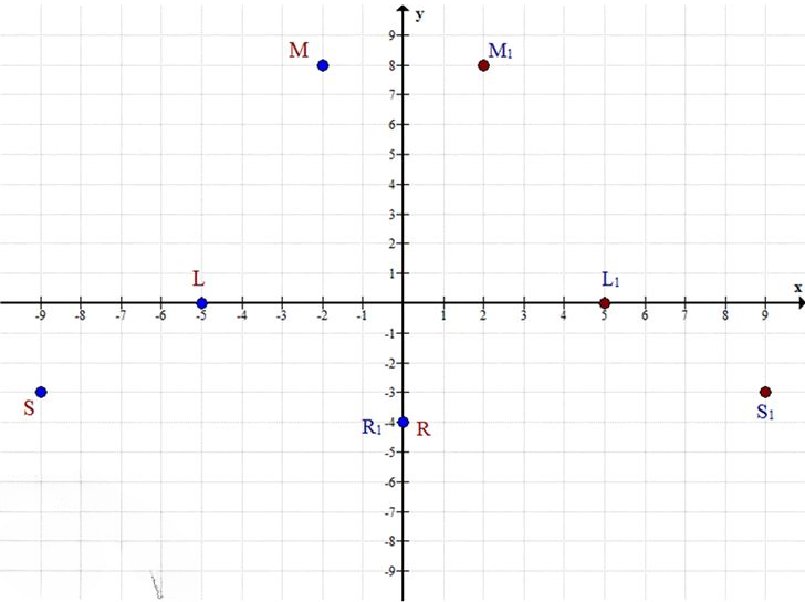 На координатной плоскости хOу найдите точку, симметричную данной точке относительно оси у: а) М(-2; 8); б) L(-5; 0); в) S(-9; -3); г) R(0; -4).