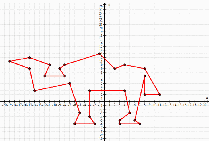 а) Последовательно соединив точки с координатами а) 1(8; 2), 2(11; 2), 3(8; 9), 4(4; 10), 5(2; 9), 6(-1; 13), 7(—8; 10), 8(-9; 9), 9(-8; 7), 10(-12; 7), 11(-11; 10), 12(—15; 12), 13(—19; 11), 14(-15; 9), 15(-14; 3), 16(-7; 5), 17(-5; -3), 15(-6; -6), 19(-2; -6), 20(-3; -4), 21 (-3; 3), 22(4; 3), 23(5; -3), 24(3; -5), 25(3; -6), 26(7; -6), 27(6; -5), 25(8; 7), получим фигуру верблюда.