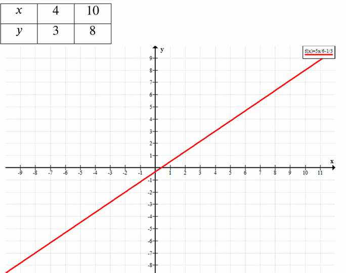 — \( x = 6 \): \( y = \frac{5}{6}(6) — \frac{1}{3} = 5 — \frac{1}{3} = \frac{14}{3} \) → \( (6, \frac{14}{3}) \)