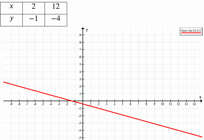 — \( x = -10 \): \( y = -\frac{3}{10}(-10) — \frac{2}{5} = 3 — \frac{2}{5} = \frac{13}{5} \) → \( (-10, \frac{13}{5}) \)
