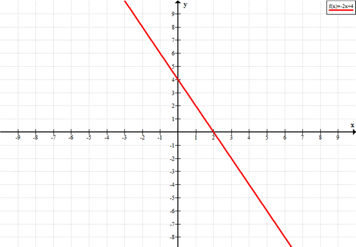 \(y = 0\), \(0 = -2x + 4\), \(2x = 4\), \(x = 2\)