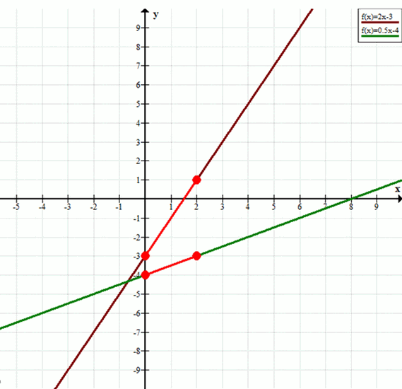 Сравнить наибольшие значения функций \(y = 2x — 3\) и \(y = 0,5x — 4\) на отрезке \([0; 2]\).