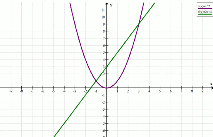 Из построенных точек видно, что графики пересекаются в точках \( (-1; 1) \) и \( (3; 9) \).